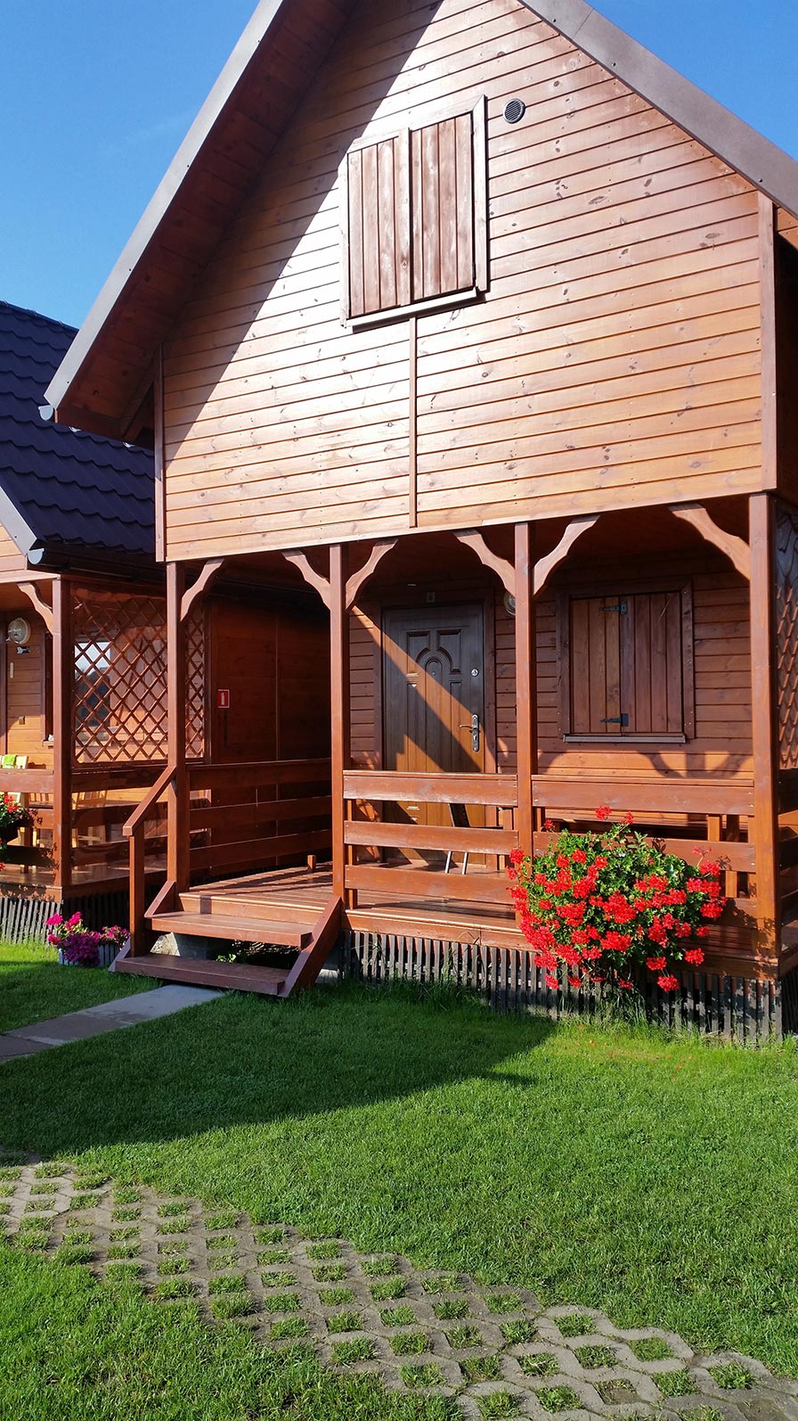 Kameralne domki usytuowane są około 380 m od morza. Przed każdym domkiem znajduje się taras z krzesłami i stołem tarasowym oraz grillem. Posesja jest bezpieczna dla dzieci, ogrodzona płotem. Posiadamy piaskownicę, huśtawki i zjeżdżalnię.